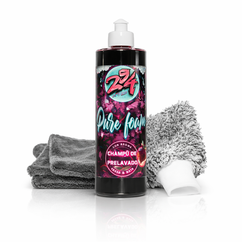 - Champú de Prelavado Pure Foam: Genera una espuma densa y abundante, con pH neutro, este champú elimina la suciedad sin dañar los acabados ni las ceras de protección. Su aroma agradable y su color rosa hacen que el proceso de lavado sea tan placentero como efectivo.